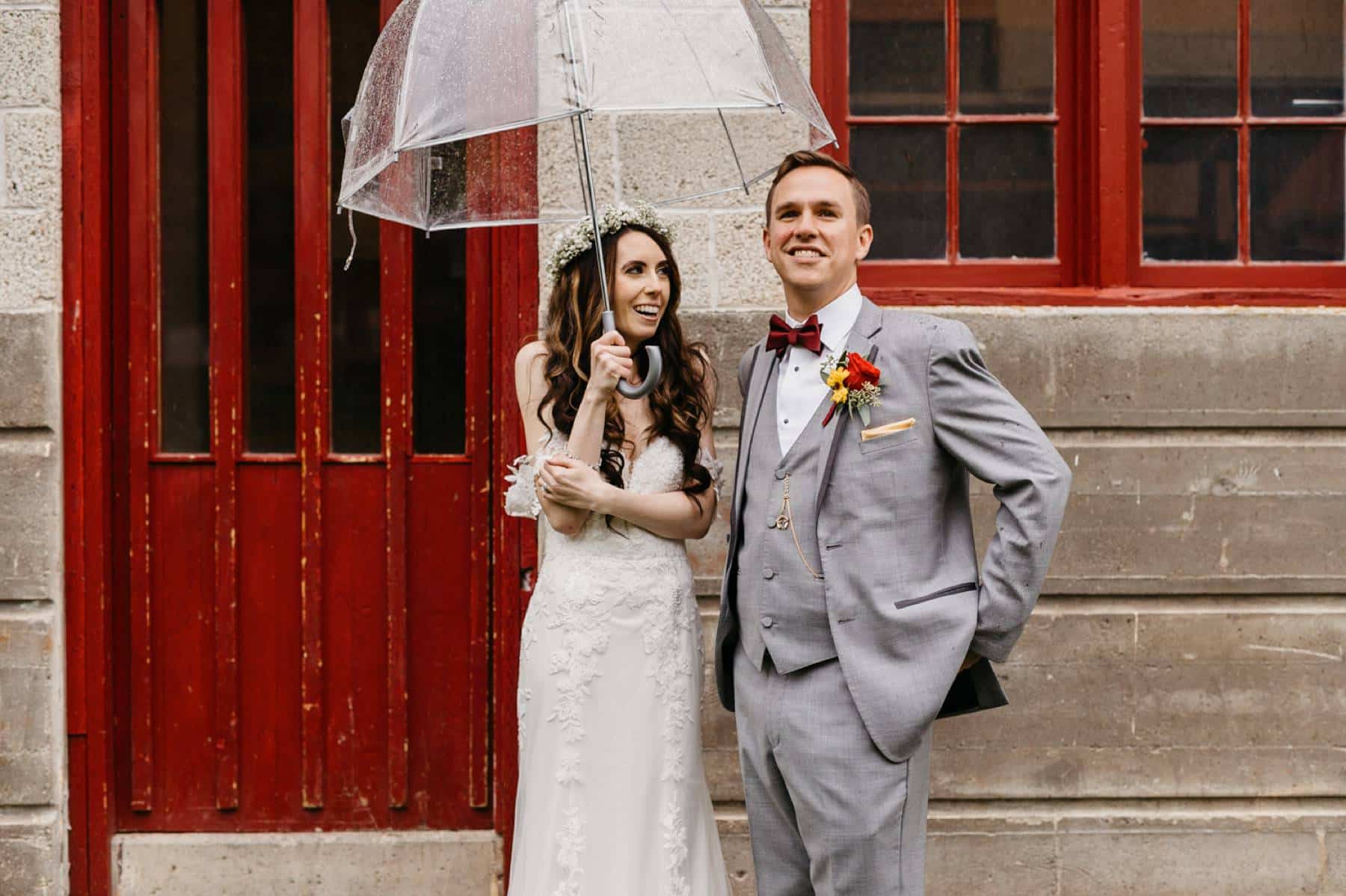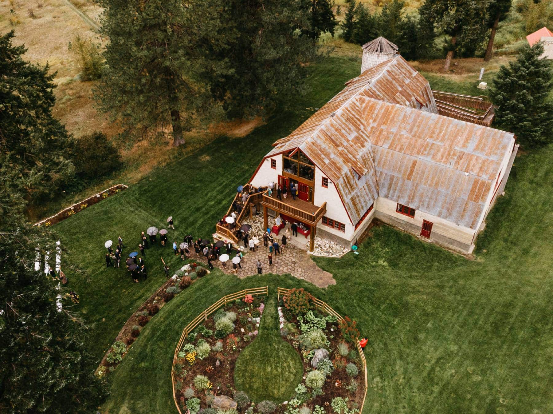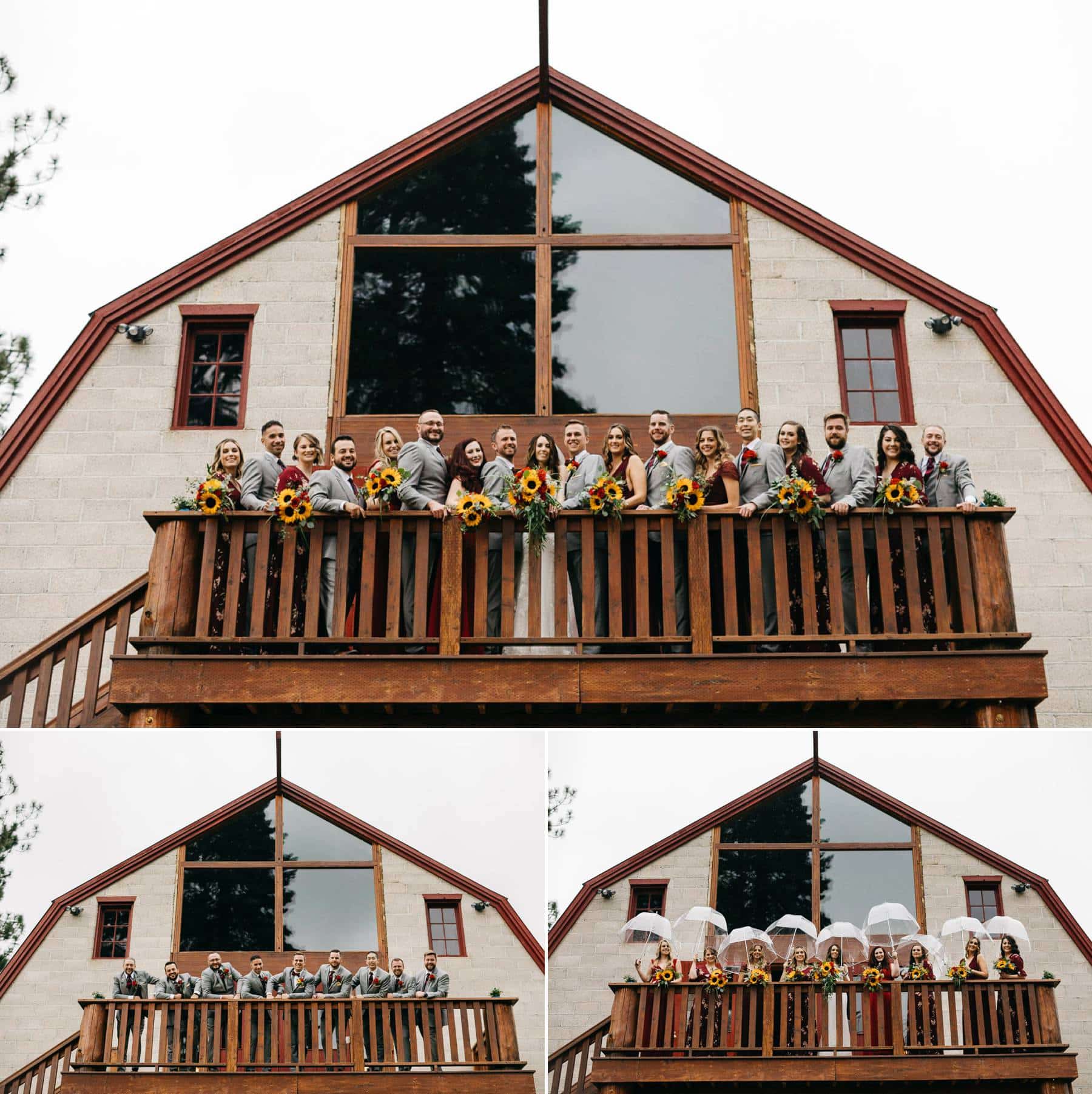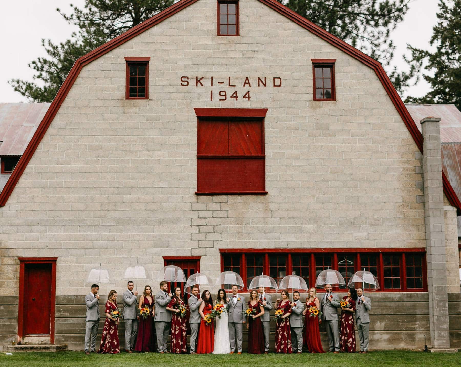 Lucy and Tyler are avid outdoor enthusiasts, so it was a lot of fun taking their wedding party photos in front of the impressive "Ski Land" building at Pine River Ranch. They were also enthusiastic about incorporating drones into their wedding, and Lucy came up with a fantastic idea of having all their guests bring umbrellas for a unique aerial shot. Since their wedding was in late September and rain was expected, it worked out perfectly.