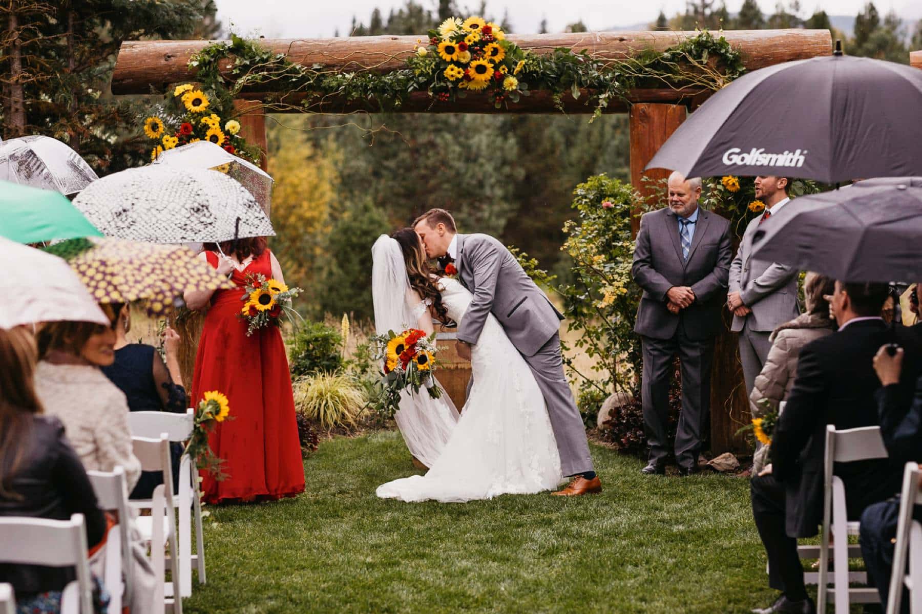 After their ceremony and first kiss, the officiant instructed the guests to open their umbrellas. I flew my drone into the sky and captured an amazing aerial photo of Lucy and Tyler sharing a final dip kiss before they walked back down the aisle.
